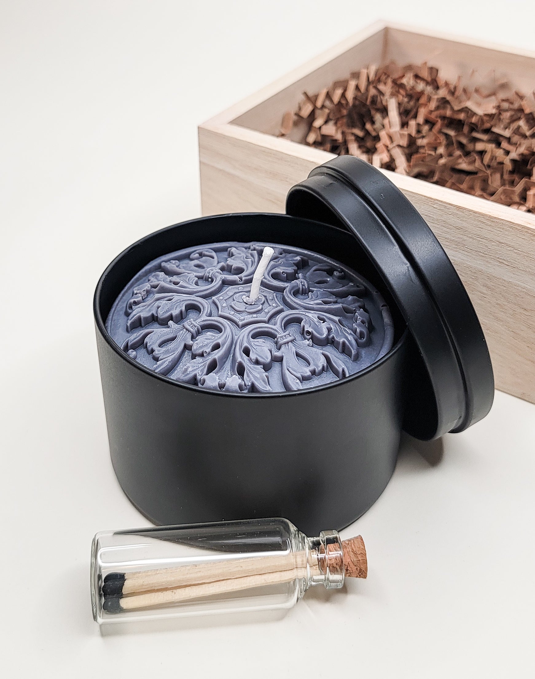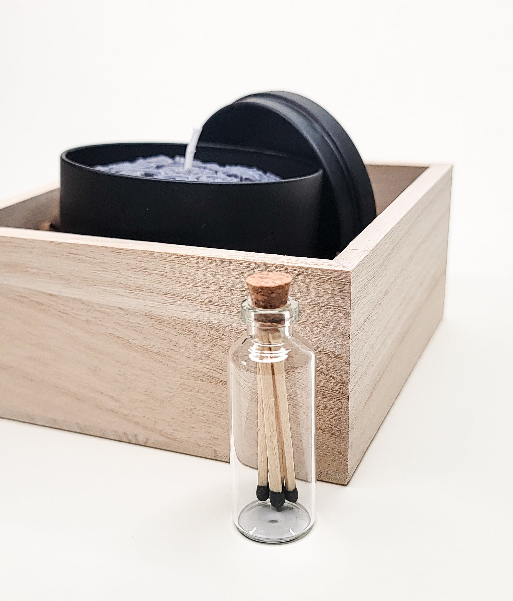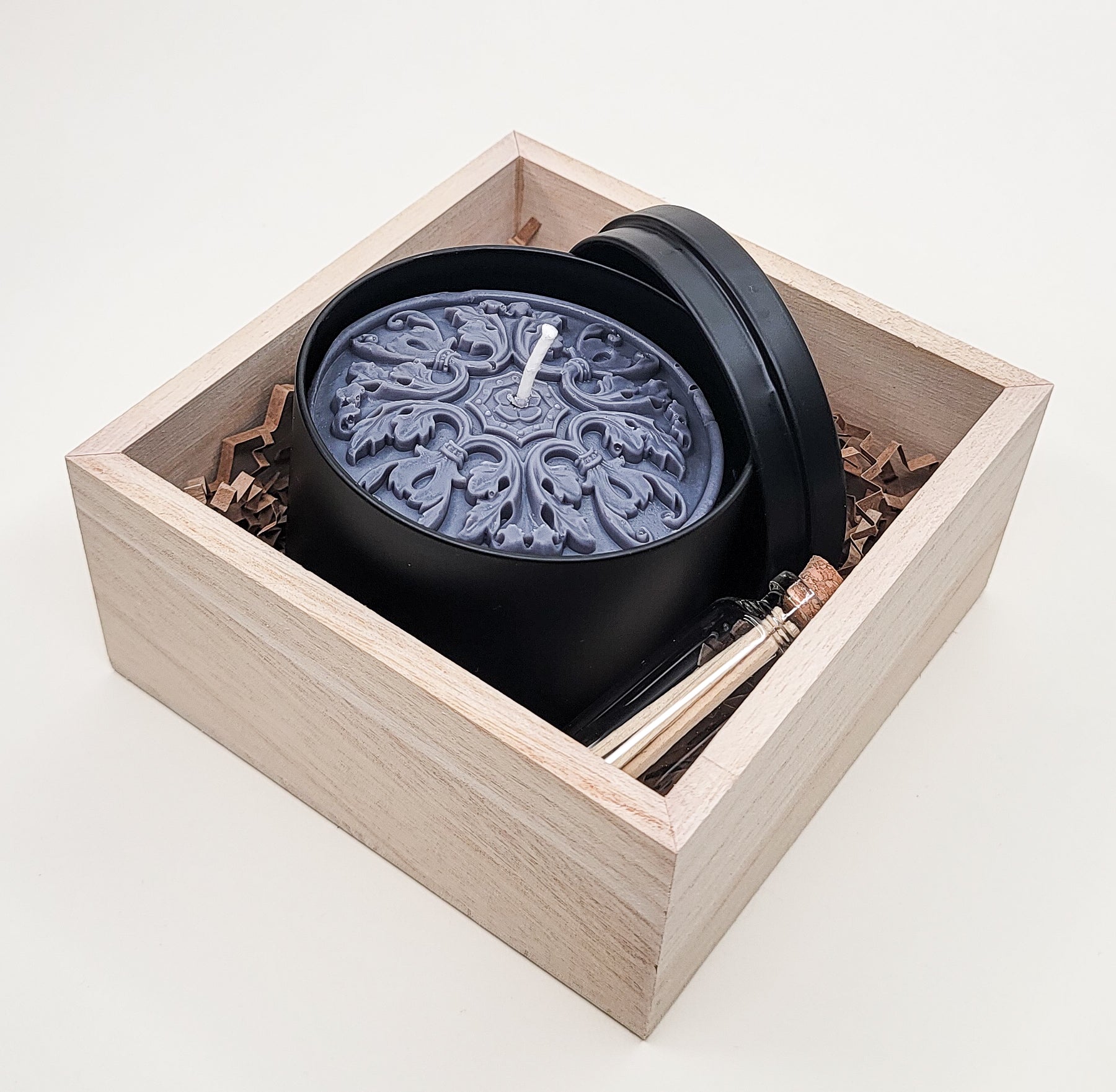 The ornate black tin candle with mini matches is the perfect addition to anyone's home décor. Its elaborate design adds a touch of elegance to any room, while the scent provides a calming and soothing ambiance. The unique design and high quality wax make for a long-lasting burn time. This gift includes a handmade candle with 100% soy wax and floral scent in a reusable metal tin, and reusable wooden box. The match bottle has a striking pad at the bottom. Warning: do not burn the candle in wooden box or near any fire hazards. After use, you can clean out wax and use the black tin to store jewelry, stationary supplies, or for small keepsakes etc. The wooden box can and be painted or stained and used as a drawer organizer or to hold office supplies, etc. This set makes a thoughtful gift set that blends elegance, sustainability and practicality.