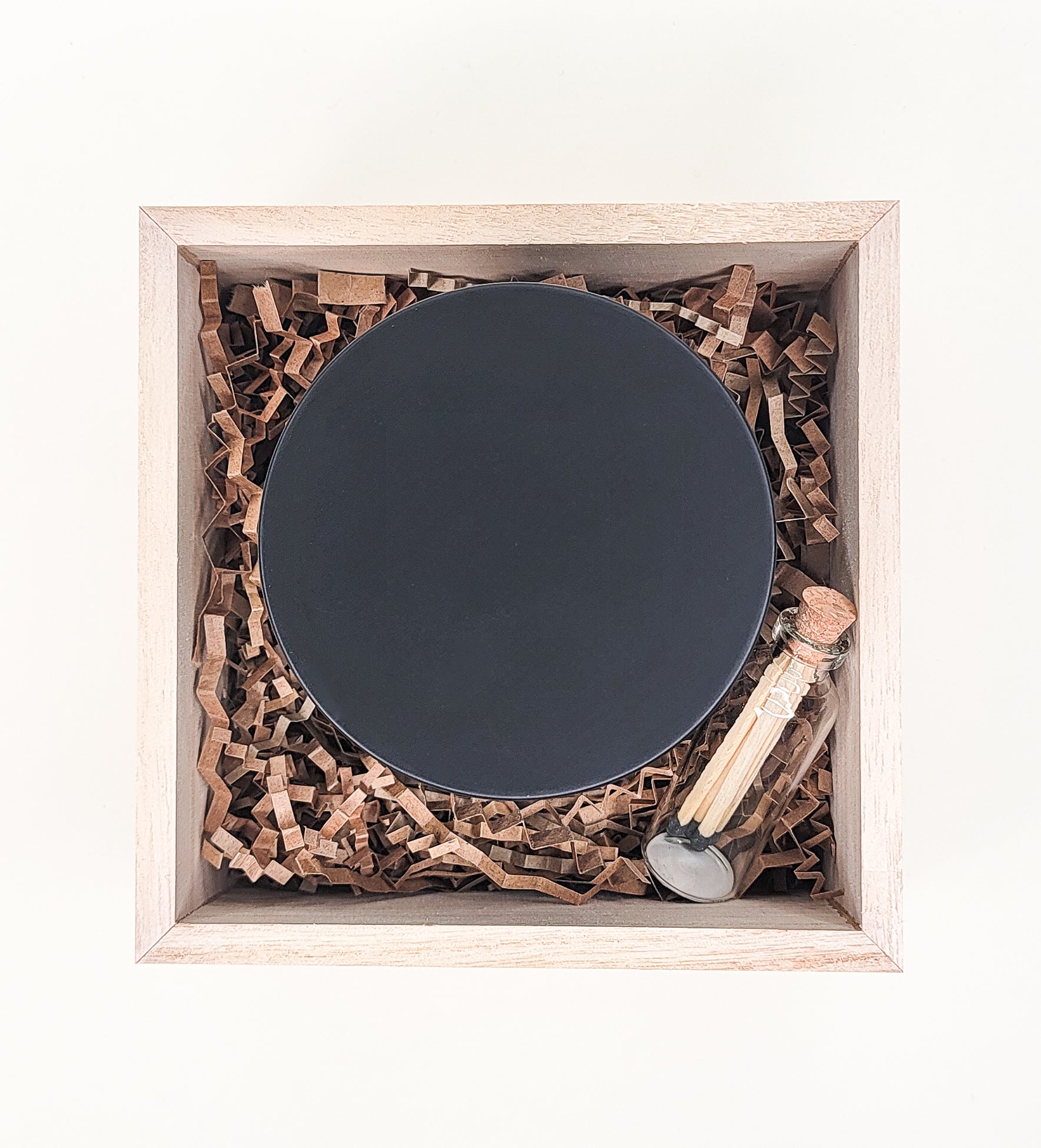Packaged with extra paper for shipping. Gift message optional. Made in USA Candle dimensions: 3.25" x 2.6" Candle material: metal tin, soy wax, fragrance oil Box dimension: 5" x 5" x 2.5" Box material: unfinished wood Mini matches dimensions: 2.4" x 0.7" Mini matches material: glass, cork, matches