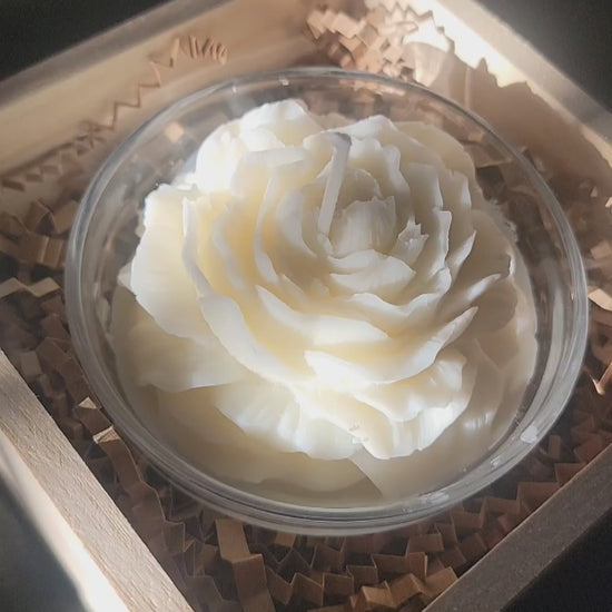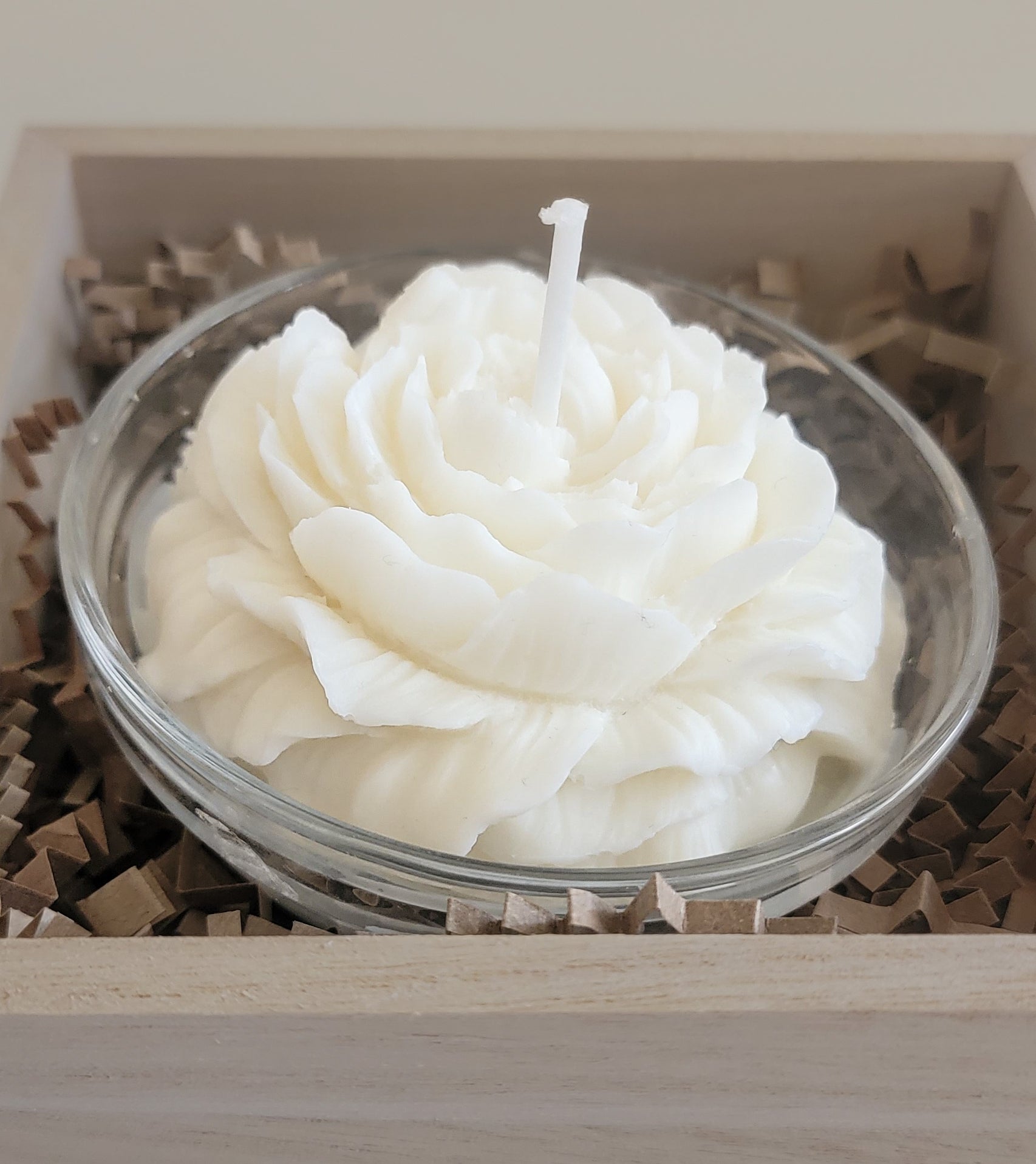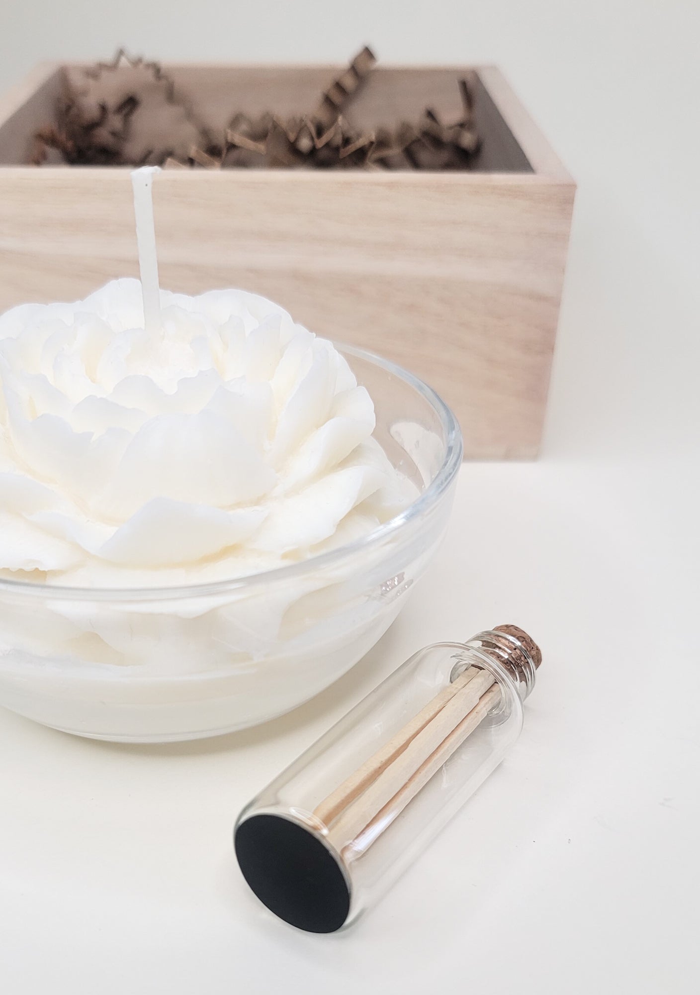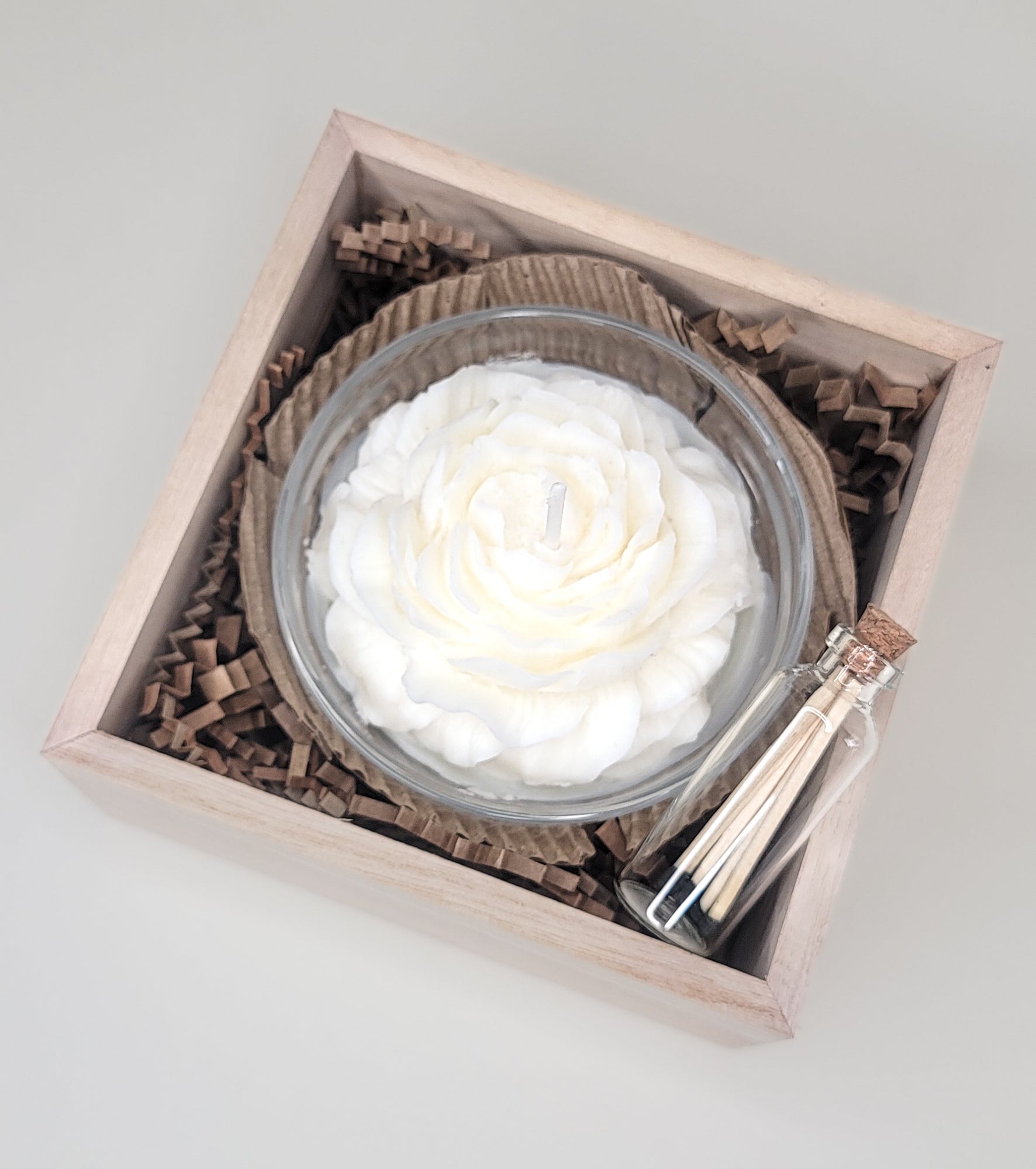 This Peony Flower Candle with mini matches is the perfect addition to anyone's home décor. Its delicate peony shape adds a touch of elegance to any room, while the scent provides a calming and soothing ambiance. The unique design and high quality wax make for a long-lasting burn time. This gift includes a handmade peony flower candle with 100% soy wax and floral scent in a reusable glass bowl, and reusable wooden box. The match bottle has a striking pad at the bottom. Warning: do not burn the candle in wooden box or near any fire hazards. After use, you can clean out wax and use the glass dish as a soap dish, or to store rings or jewelry next to the sink, or for trinkets etc. The wooden box can and be painted or stained and used as a drawer organizer or to hold office supplies, etc.