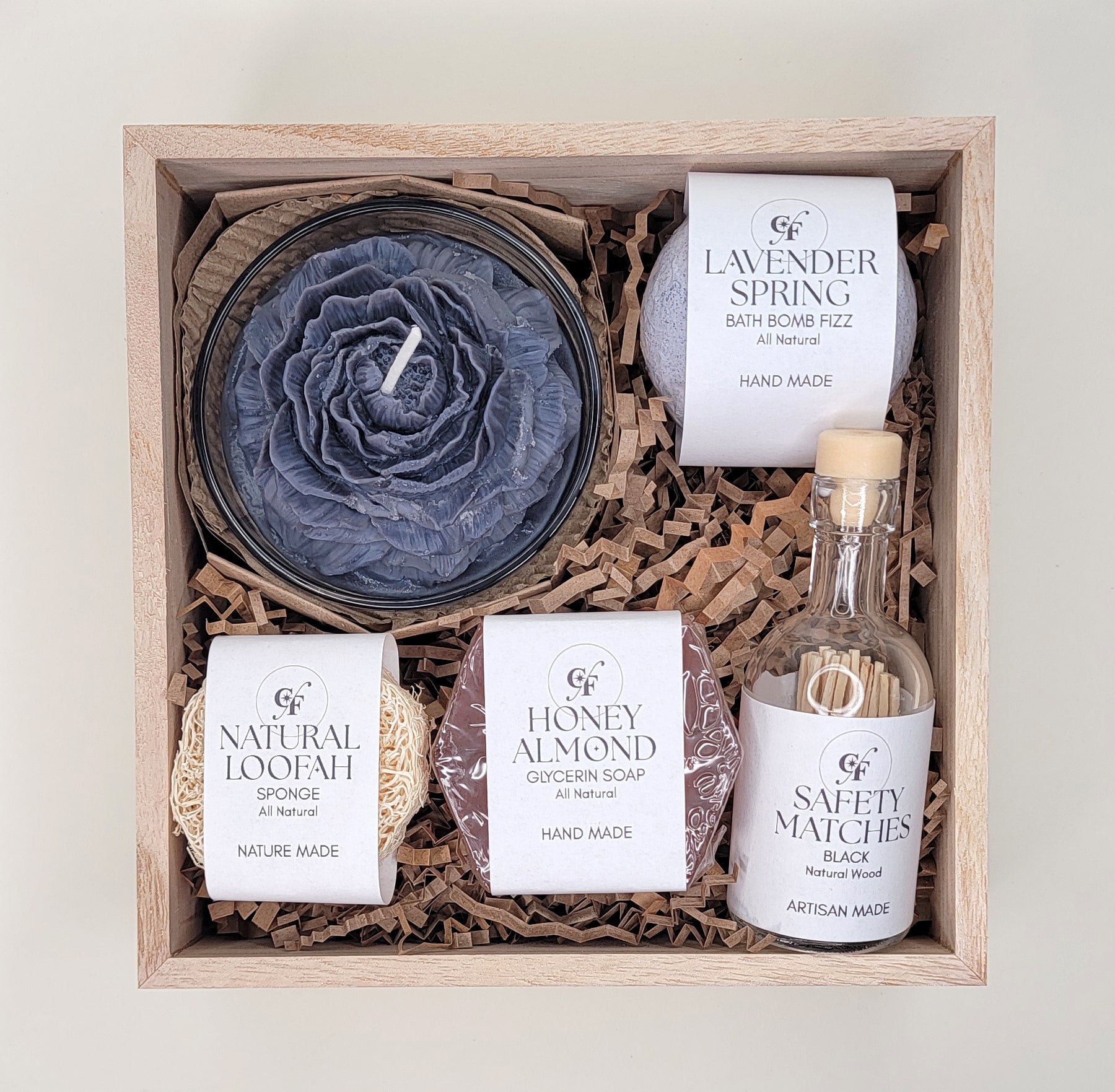 Relax with this perfect bath gift set. Complete with a handmade lavender bath bomb fizz, a handmade honey almond glycerin soap, a natural loofah, a handmade peony flower candle with 100% soy wax in a floral scent, and bottle of safety matches with striking pad at the bottom all tucked in a reusable wooden box. This relaxation bath gift set is perfect for anyone in need of some pampering and self-care. Treat yourself or a loved one to the ultimate relaxation experience with this gift set. Warning: do not burn the candle in wooden box or near any fire hazards.